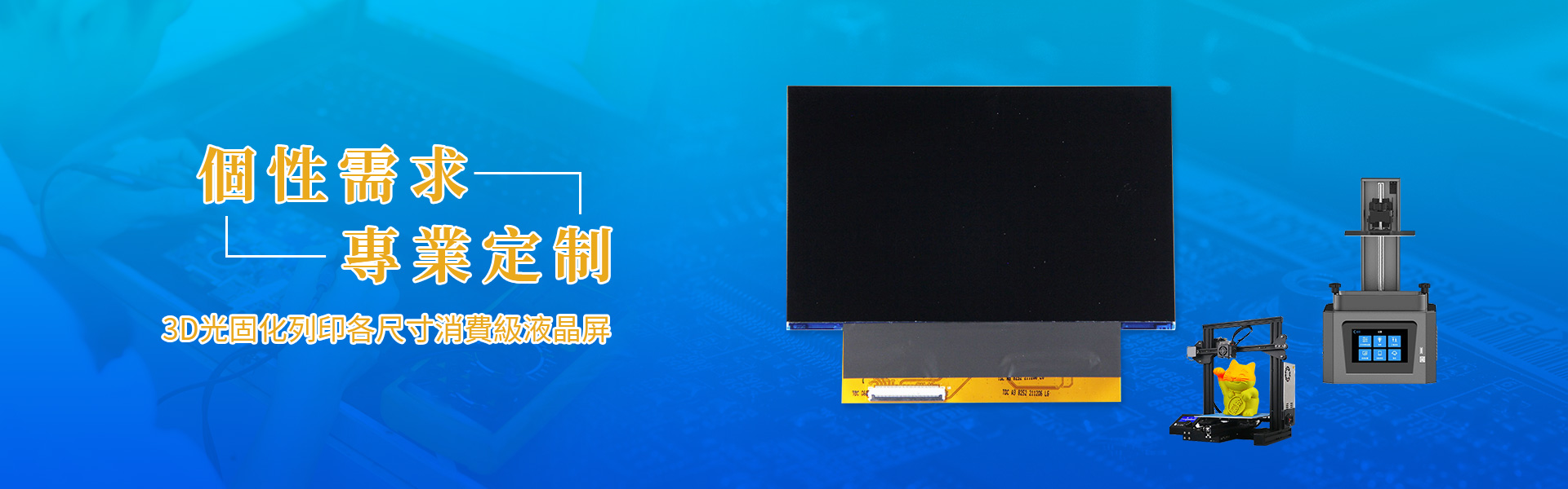 產品鏈條涵蓋3D光固化打印設備全球前五大終端,提供一站式的服務。主要產品尺寸6.6寸 ~14寸。擁有配套的3D光固化打印應用液晶顯示屏贴合廠,為終端客戶提供一站式優質服務。